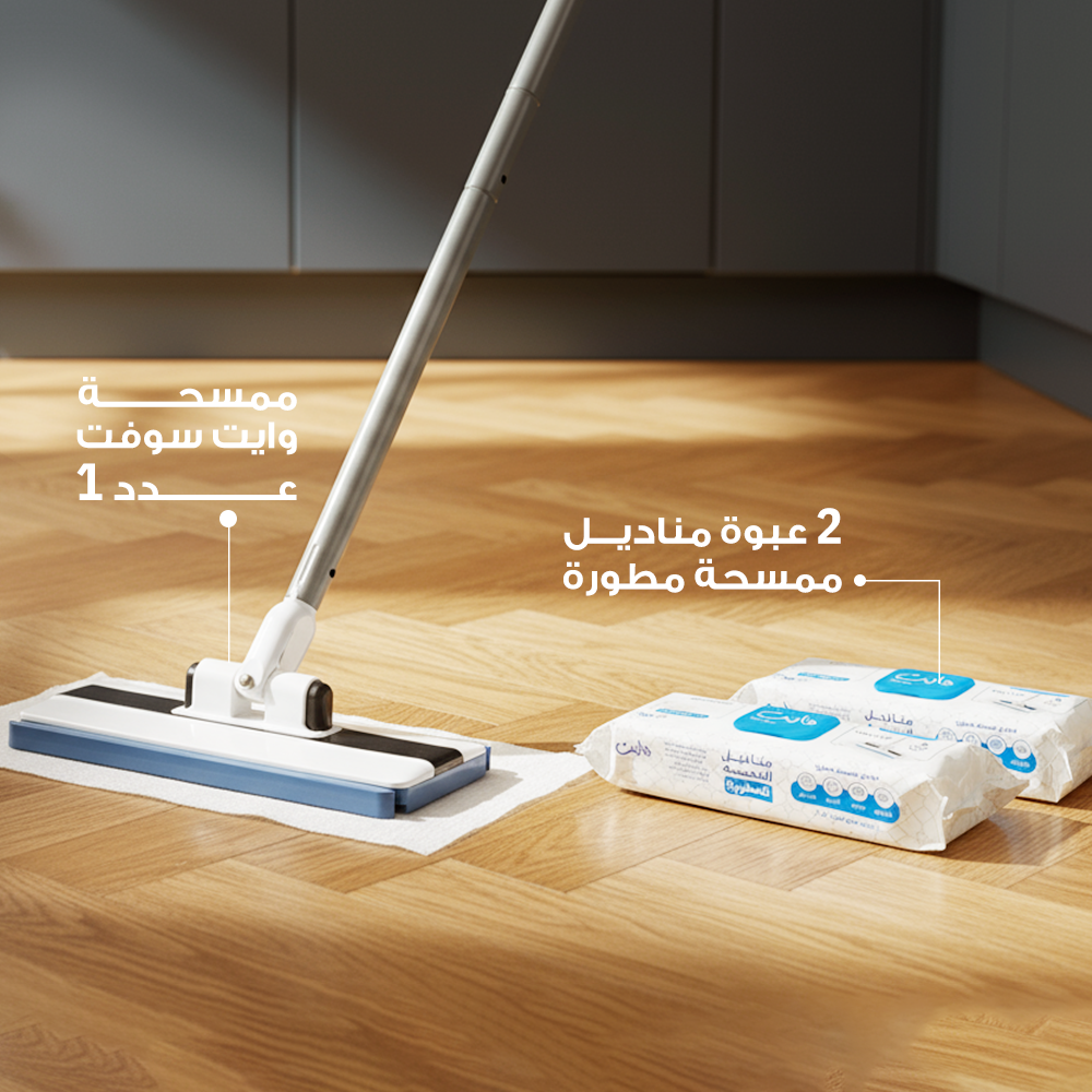 استمتع بتجربة تنظيف سهلة ومريحة مع ممسحة تنظيف من وايت سوفت المزودة بعبوتين من مناديل التنظيف المبللة للاستعمال الواحد، المصممة لتمنحك نظافة مثالية بدون عناء.